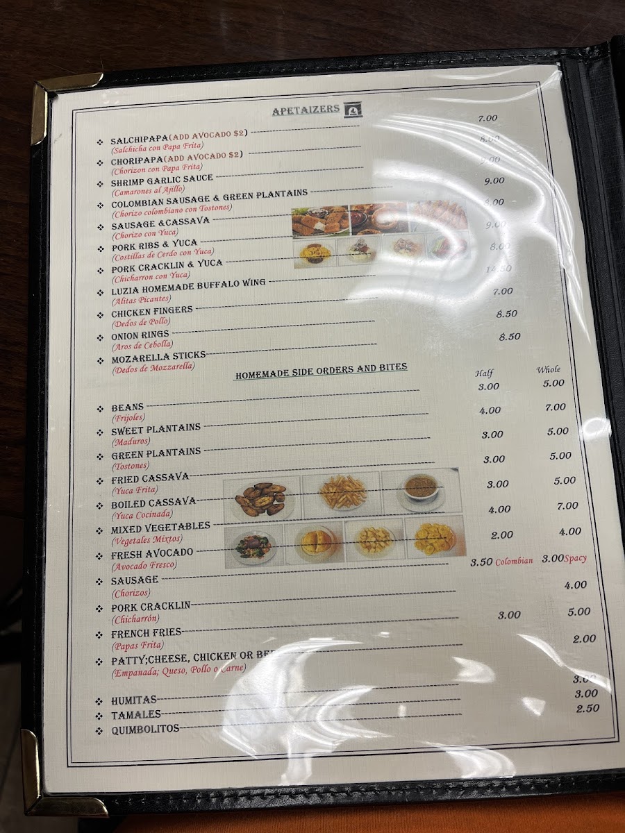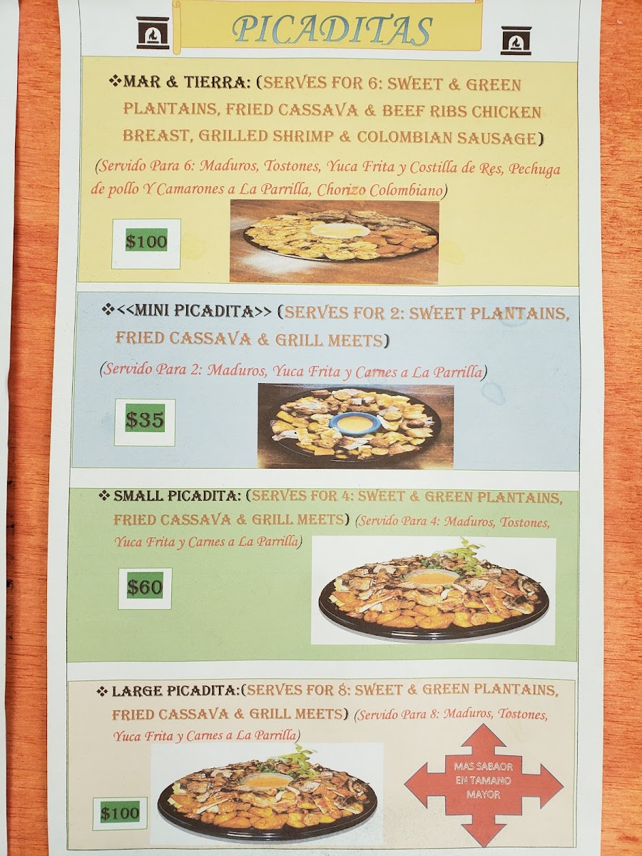 Rice, French Fries, Sweet Plantains, Chicken, Pork Ribs, Beef Ribs, Pork Chops, Beef Steaks, Pork Sausage, and Pork Crackling. Arroz, Papas Fritas, Maduro, Pollo, Costillas de Cerdo, Costillas de Res, Chuleta, Bistec de Res, Chorizo, y Chicharrón.